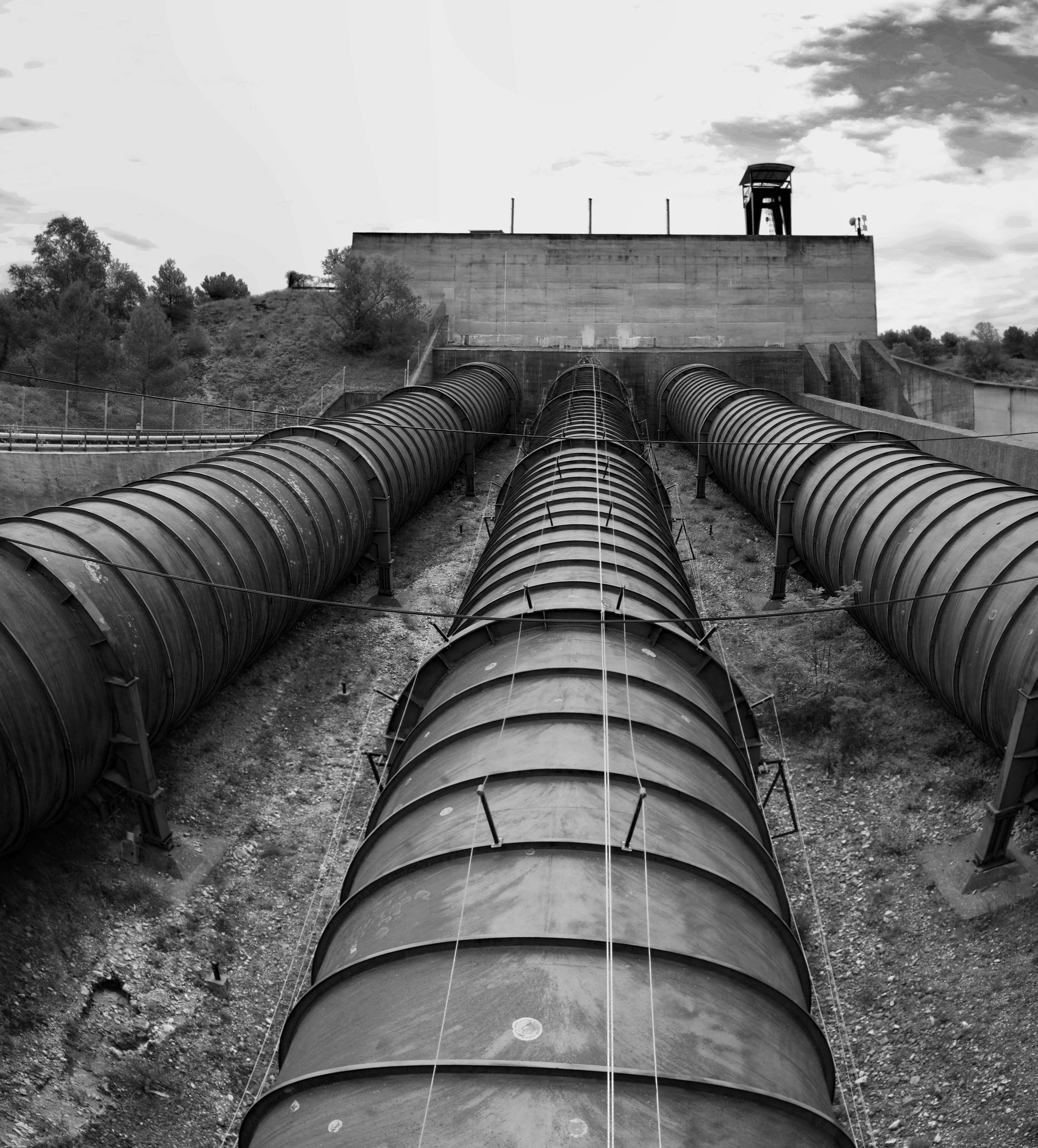 Comment ne pas être saisi par le gigantisme de ces trois conduites qui dévalent la pente et traversent la route sous un pont aux rambardes bleues. Il y a seulement 44 m de dénivelée mais les conduites font 8m de diamètre et débitent 245m3 d'eau par seconde...