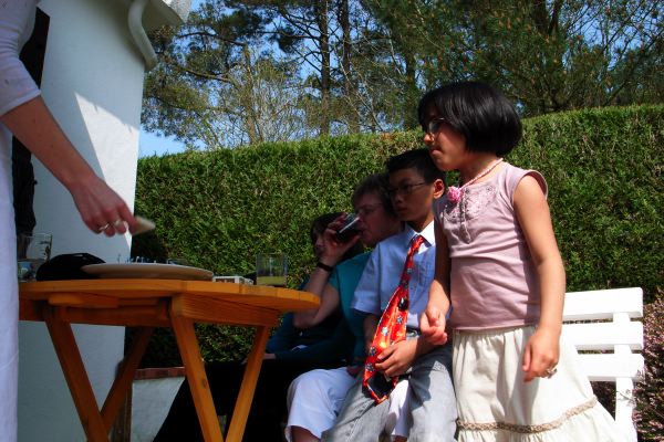 Les enfants, toujours sages, se classent par age et par taille et guettent la Main Nourricière